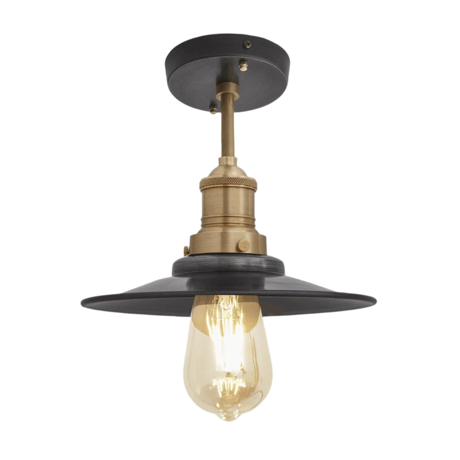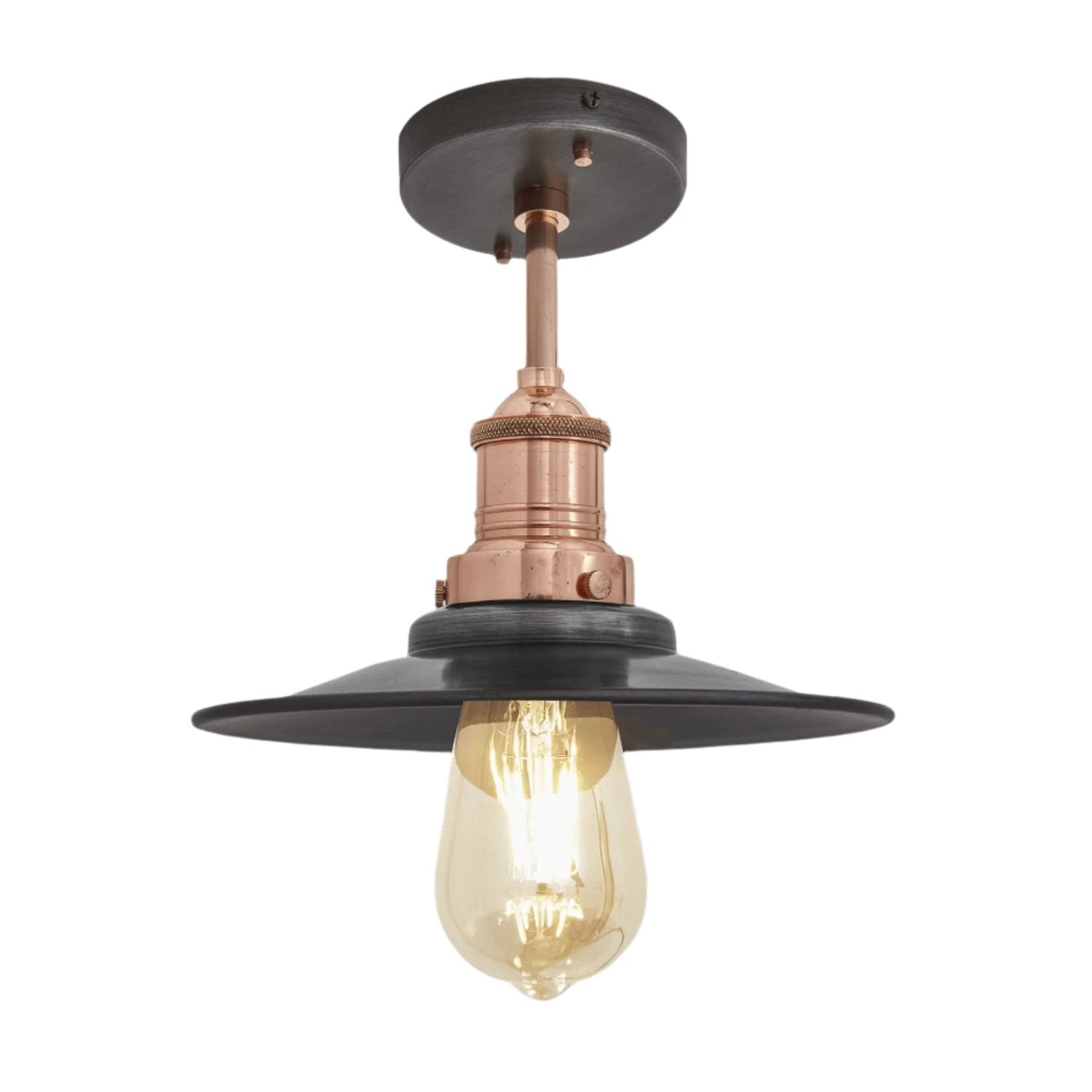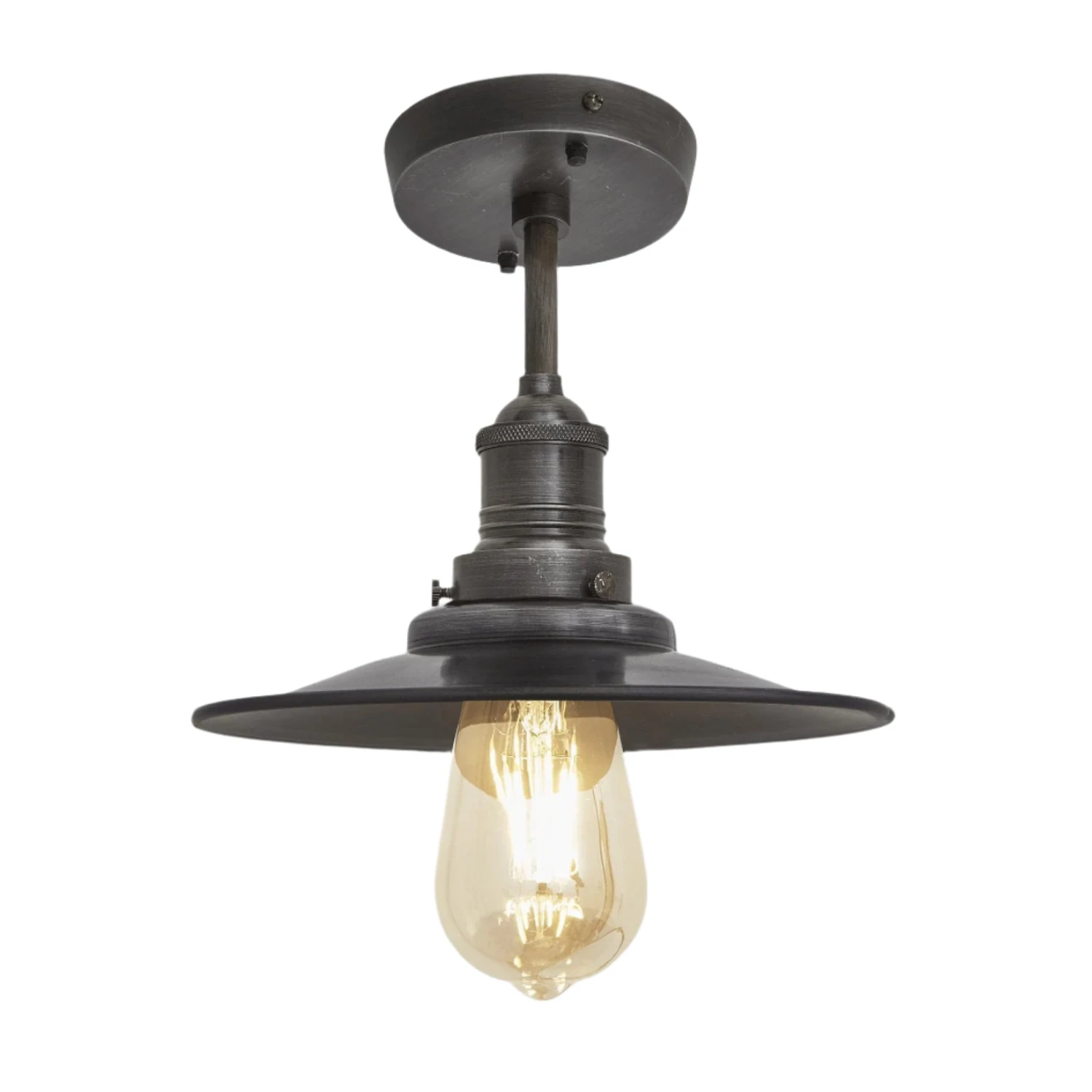 The industrial trend is transforming the interiors of homes and businesses around the UK and beyond. Our Brooklyn Flat 8 Inch Flush Mount is available with a matching Brooklyn Wall Light and Pendant. This product is also available in Brass and Copper. This shade also comes in a larger 15 Inch Flush Mount in Brass, Pewter and Copper.