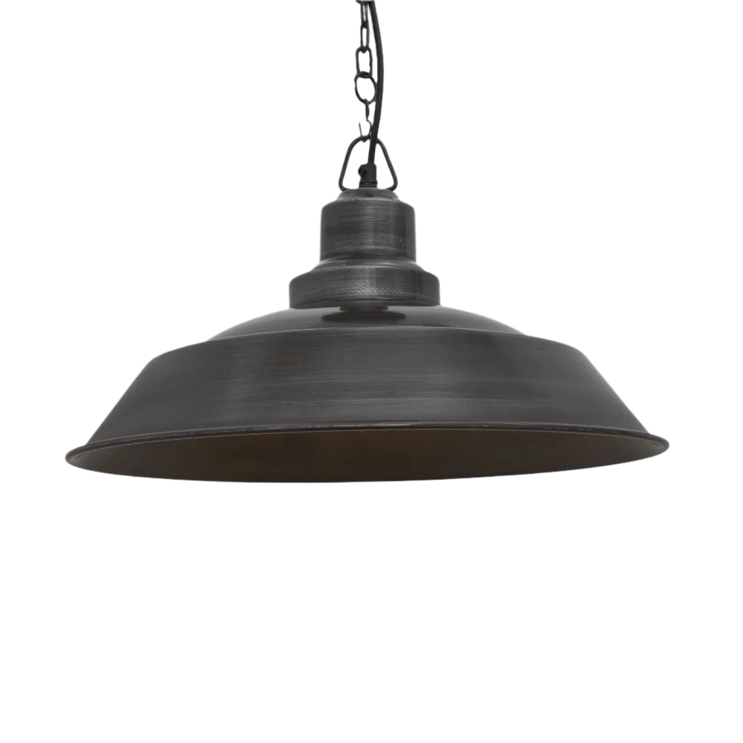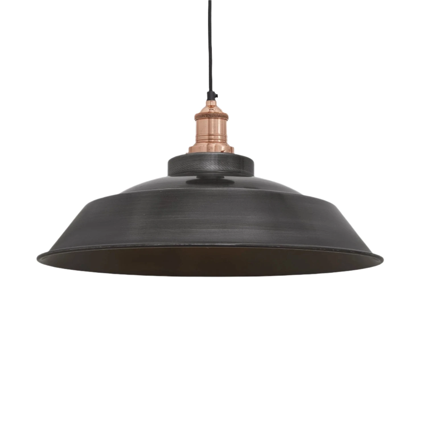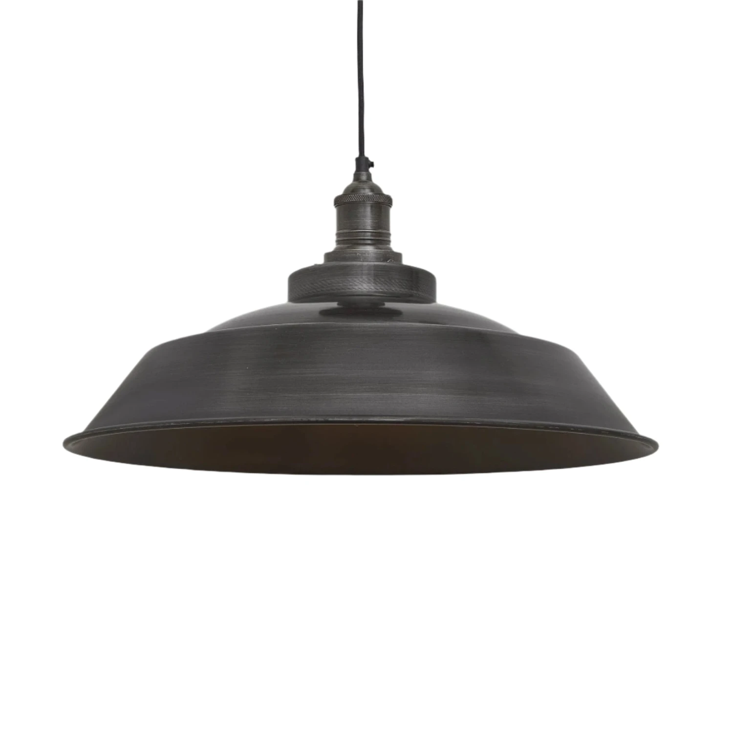 The Step 16 Inch Pendant is also available in Brass. This Light is also available as a Flush Mount in Brass or Pewter. The beautiful Light is available with or without a cage, and also has a slightly larger variation of 18 Inch Pendant in Brass and Pewter and can be used together for the ultimate Lighting combination. This Light fixture comes with a 1 M Black Round Fabric Flex Cable. This Pendant is perfect for any space, as it gives you that modern industrial metal look.