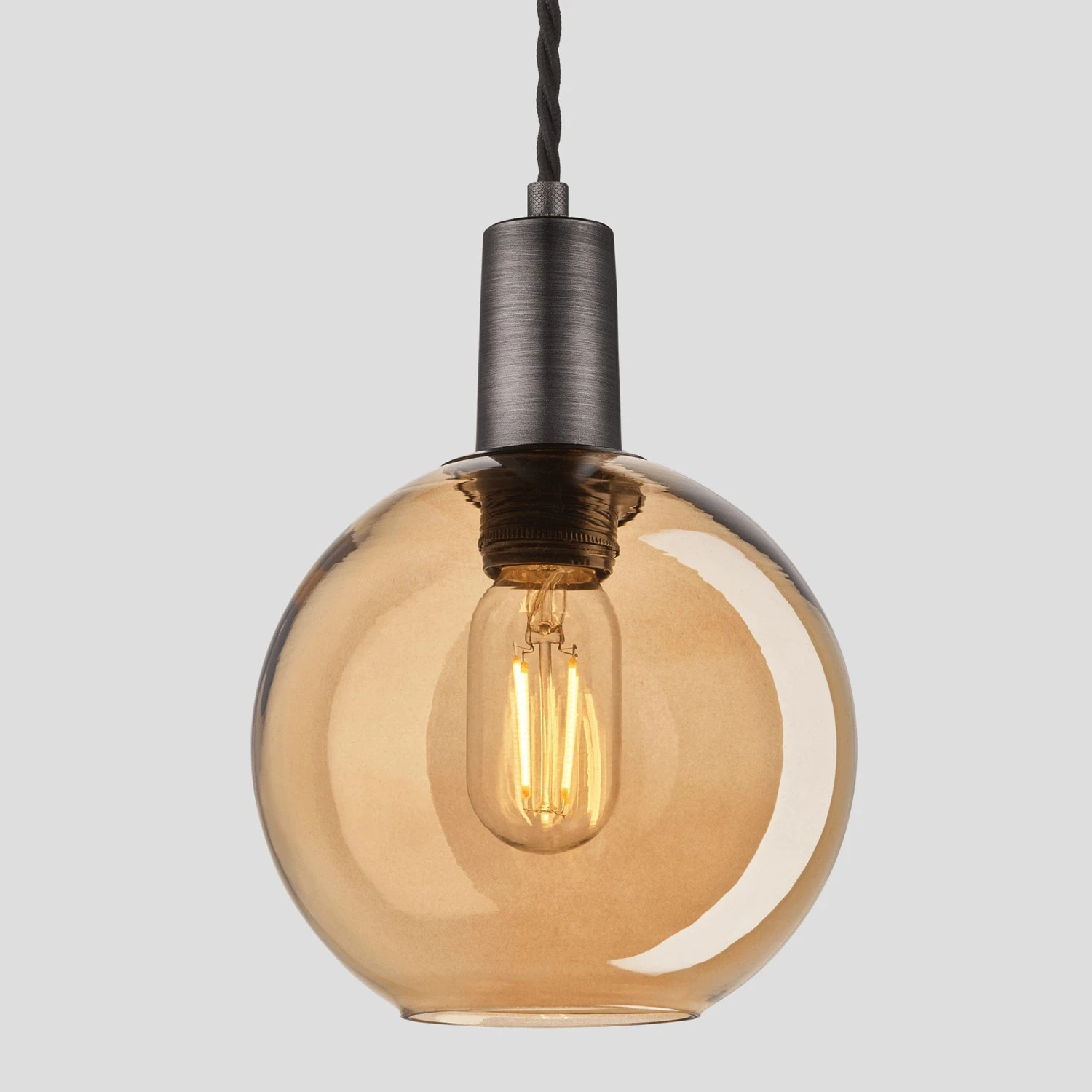 Our Tinted Glass Globe Shades provide a dynamic silhouette, infusing your space with instant character and style. You can place a Glass Globe Pendant light above your dining table or sofa to create a warm, inviting glow. The amber glass finish will dim the light passing through, creating a delicate ambience for your living space. This charming pendant light hangs elegantly from a wire stem that can be adjusted to suit the height of your ceiling.